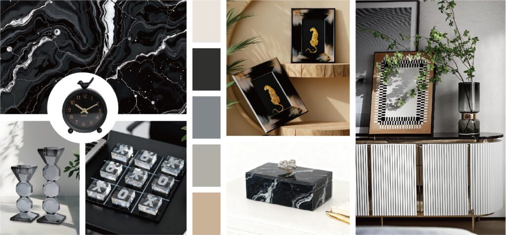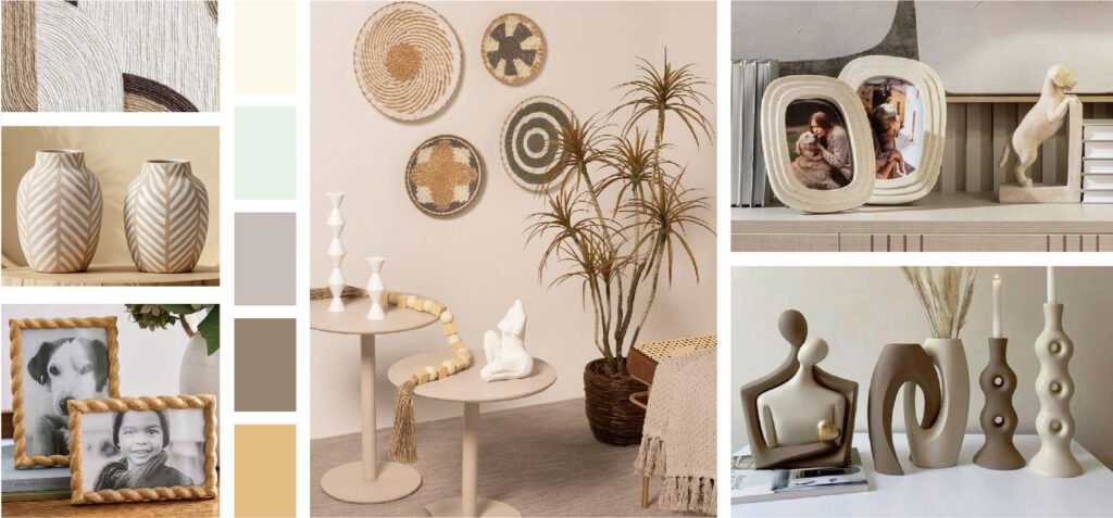 This collection is defined by a pleasing mix of greys, browns, and orange hues, featuring organic shapes paired with clean lines, gentle curves, bold stripes, and dynamic twists. These elements create a captivating rhythm, while repeated patterns and thoughtful combinations add depth and con- tinuity for a cohesive aesthetic. Materials like wood, cork, glass, brass, wo- ven fabrics, leather, and ceramics blend seamlessly to create an interior that fuses multiple styles effortlessly. The result is a refined yet inviting space where diverse textures and elements harmonize, offering a perfect balance of modern sophistication and timeless charm.