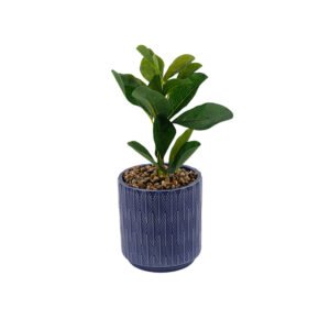 Mini Artificial Plant in Blue Geometric Pot with Carved Pattern, Compact Greenery Ornament for Office, Bedroom, or Coffee Table