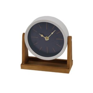 Modern Round Desk Clock with Black Dial and Golden Hands, White Circular Frame on Wooden Stand, Decorative Tabletop Timepiece for Home and Office