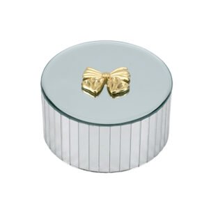 large-sized Round Mirrored Jewelry Box with Gold Bow Accent Elegant Silver Striped Glass Trinket Box for Rings, Earrings, Necklaces
