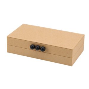 large-sized Elegant Jewelry Box Organizer with Beige Leather and Brown Accents, Compact Storage Case with Gold Button Clasp for Rings, Earrings, Necklaces, and Bracelets