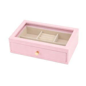 Modern Minimalist Pink Wooden Jewelry Organizer – Glass Window Jewelry Box, Large Capacity with Drawer Jewelry Gift Box, Velvet Lining Protection, Gold Knob Exquisite Desktop Decor, Ideal Gift for Women and Girls