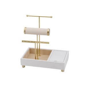 White & Gold Jewelry Stand with Storage Drawer, Multi – Tiered Organizer with T – Bar & Bracelet Roll, Standing Jewelry Box for Necklaces, Bracelets