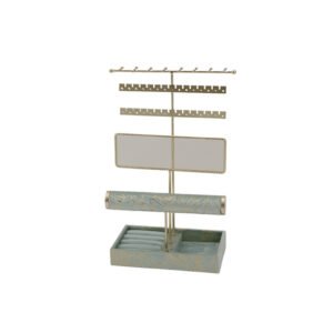 Multi – Tiered Jewelry Organizer Stand Blue & Gold Decorative Jewelry Holder with Hooks, Perforated Bars, Mesh Panel, Cylinder & Velvet Tray for Necklaces, Earrings, Bracelets