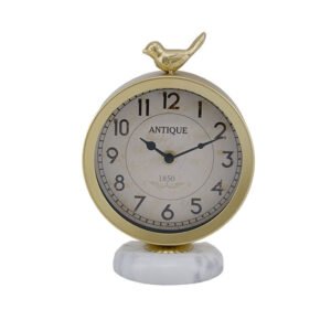 Vintage Luxury Gold Metal Table Clock with Natural Marble Base and Artistic Bird Figurine, 8-Inch Silent Non-Ticking Clock, European Pastoral Style Desktop Clocks for Living Room, Office & Bookshelf Decor, Premium Artistic Home Decor Gift