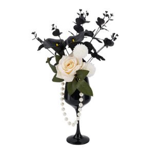 Elegant Black Wine Glass Floral Ornament with Artificial Flowers & Pearl Accents, Glamorous Home Decor for Dining Table & Mantel