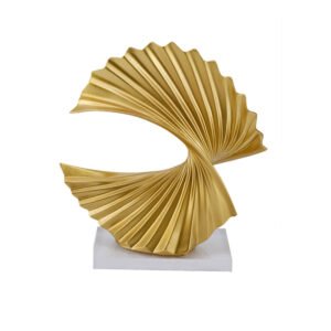 Large Gold Spiral Fan Abstract Sculpture on White Plinth — Dramatic Twisted Metal-Style Decorative Accent, High-Impact Tabletop Ornament for Modern Interiors