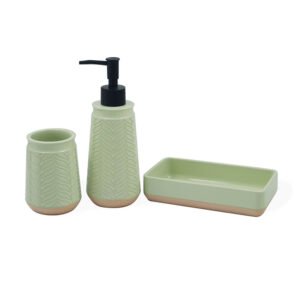 Modern Rustic Light Green Embossed Leaf Texture 3-Piece Bathroom Set, Includes Lotion Dispenser/Toothbrush Holder/Soap Dish, Premium Resin Countertop Decor