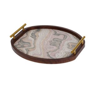 Modern Luxury Marble Pattern Wooden Oval Decorative Tray with Exquisite Polished Gold Metal Handles, Multi-functional Artistic Tabletop Storage tray, Stylish Home Aesthetic Display trays for Coffee Table, Bedroom Vanity and High-end Gifting