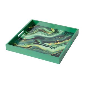 Modern Luxury Liquid Gold Marble Texture Tray – Artistic Emerald Green & Gold Polka Dot Decorative Trays, Premium Glossy Serving Platter with Handles for Coffee Table Organizing, Jewelry Display and Exquisite Home Decor