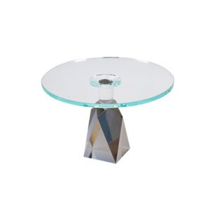 Round Glass Display Tray with Thick Clear Top and Faceted Crystal Pedestal Base, Modern Decorative Jewelry Tray & Serving Display Stand