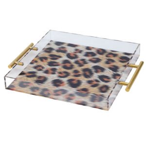 large-sized Rectangular Acrylic Leopard Print Tray with Golden Side Handles, Modern Decorative Jewelry Tray for Vanity, Coffee Table, or Bathtub Tray Use