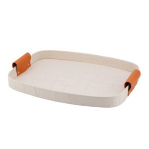 large-sized White & Brown – Grain Faux Leather Tray with Raised Edge, Multi – Purpose Rectangular Tray for Fruits, TV Side, Jewelry Storage
