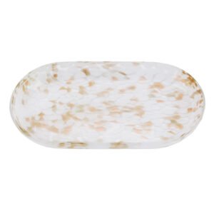 Oval Glass Tray with White and Gold Speckled Pattern, Elegant Jewelry Tray for Vanity, Decorative Bathtub Tray for Bathroom Accessories