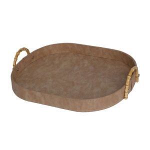 large-sized Modern Luxury PU Leather Decorative Tray, Premium Tabletop Storage Trayswith Bamboo-Style Metal Handles, Vintage Rectangular Serving Platter for Coffee Table, Ottoman, and Living Room Decor