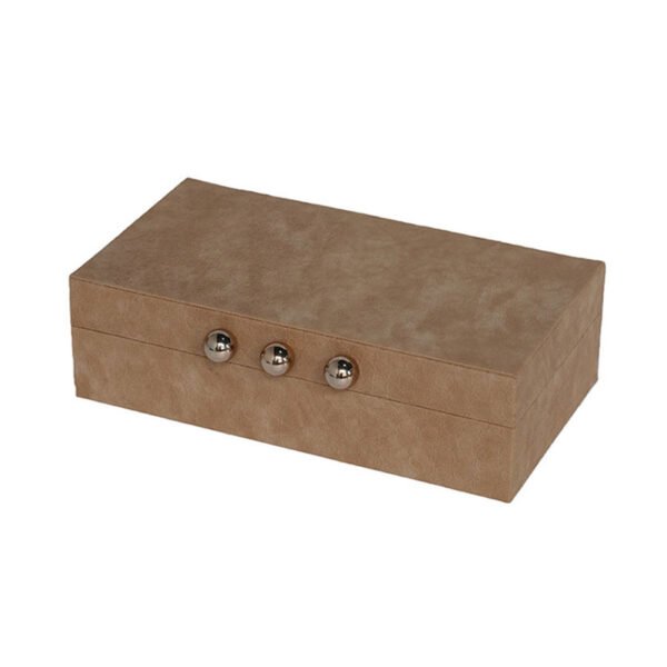 • This jewelry box perfectly embodies the “less is more” philosophy, featuring a clean, structured rectangular silhouette with modern, sharp lines. The exterior boasts a sophisticated matte tan (camel) finish that feels warm to the touch and provides a soothing visual comfort. The most striking highlight is the polished silver sphere clasp at the center; its mirror-like metallic finish creates a bold contrast against the understated box color. This design not only allows for easy one-handed access but serves as a brilliant focal point, ensuring this PU jewelry box stands out on any vanity.