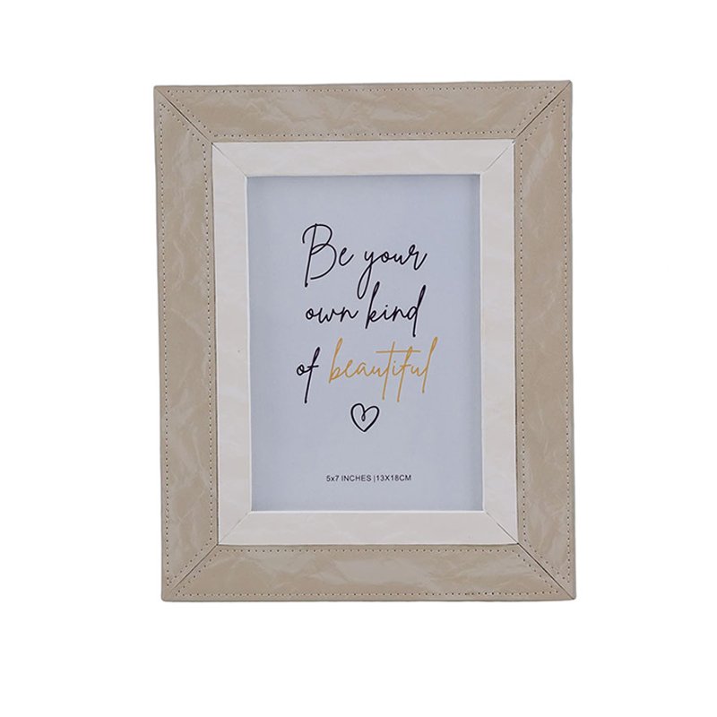 • This exquisite photo frame features a sophisticated two-tone patchwork design, seamlessly blending a deep beige outer border with a soft off-white inner frame to create a richly layered visual effect. The surface is adorned with a unique crinkled texture that is delicate to the touch and exudes a texture reminiscent of high-end leather goods. To enhance both durability and aesthetic appeal, the edges are detailed with fine, uniform perimeter stitching in a matching tone. This superb craftsmanship ensures that this photo frame and home accessory radiates luxury through its simplicity, making it a striking focal point on any tabletop.