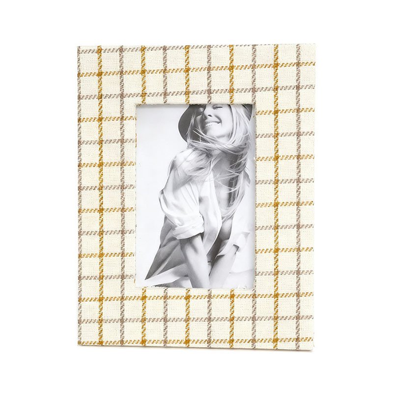 • This elegant Plaid Photo Frame features a classic vertical rectangular design, suitable for displaying 4×6 inch photos. The frame surface is covered with a textured finish featuring a clear Scottish Plaid (Tartan) pattern. The base color is a soft cream white or light taupe, with the grid pattern formed by delicate yellow-brown and gray lines intersecting, creating a warm, fabric-like visual effect. The frame has clean edges and is fitted with a clear glass or acrylic protective layer. It includes a sturdy easel back for stable tabletop display, making it a rustic-styled PU Photo Frame.
