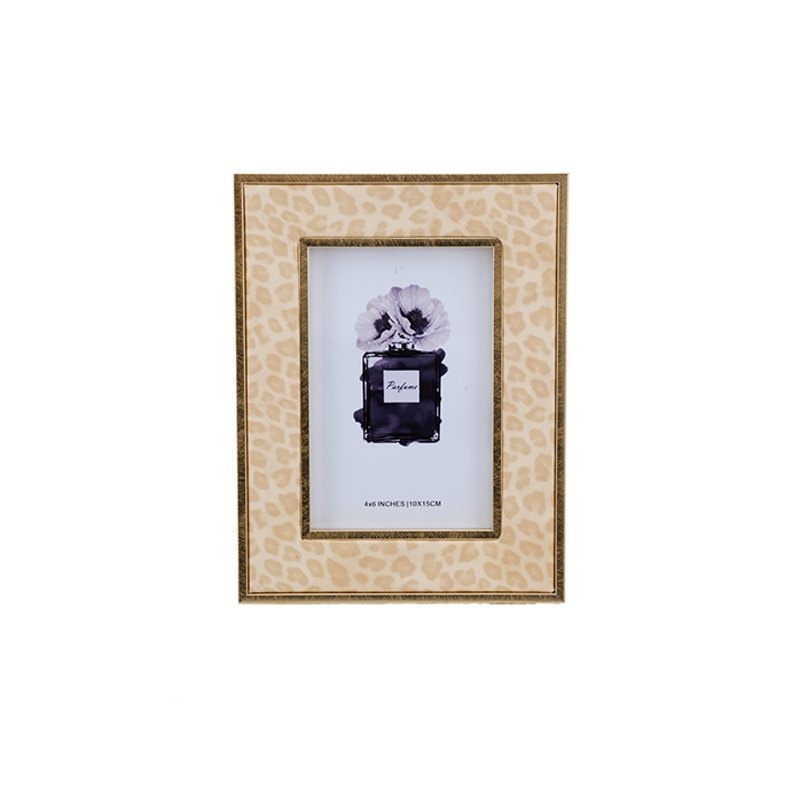 • Designed with a beige textured surface and gold trim, this photo frame combines simplicity with elegance.