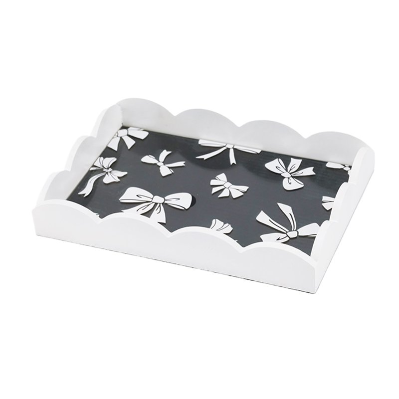 Home - HOME DECOR - Tray - Bow-Patterned Black & White Decorative Tray with Scalloped Edge, Stylish Organizer Tray for Home, Vanity & Coffee Table Tray