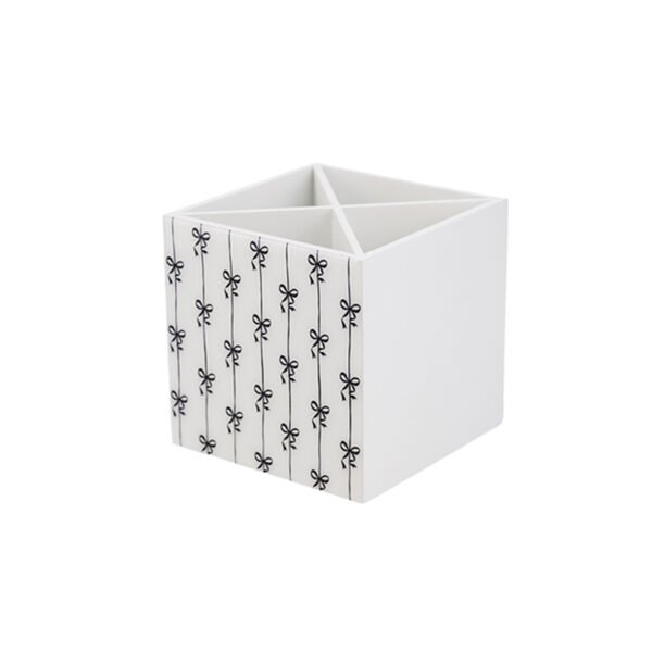 • Minimalist White Cube Shape with Black and White Bowknot Print: This organizer box features a clean cube silhouette with a sturdy structure and flat sides. The interior is divided into four separate triangular compartments, ideal for categorized organization. The main color is pure white (assumed wood or MDF material), and one side is printed with a repeating pattern of black, hand-drawn style bowknots, arranged vertically. The black and white scheme creates a classic, stylish, and versatile look, adding a touch of cuteness and artistry to this practical desktop tool.