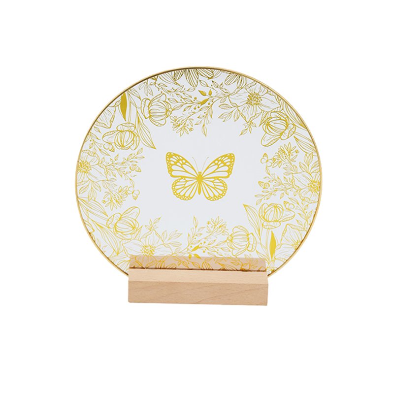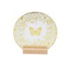 Home - HOME DECOR - Ornament - Clear Glass Display Plate with Intricate Gold Butterfly & Botanical Motif on Center, Decorative Round Plaque with Natural Wood Stand — Elegant Tabletop Ornament & Seasonal Display