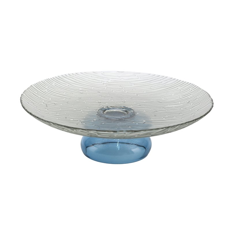 Clear Textured Glass Round Tray with Blue Base, Decorative Serving Tray and Jewelry Tray for Dining Table or Vanity Display