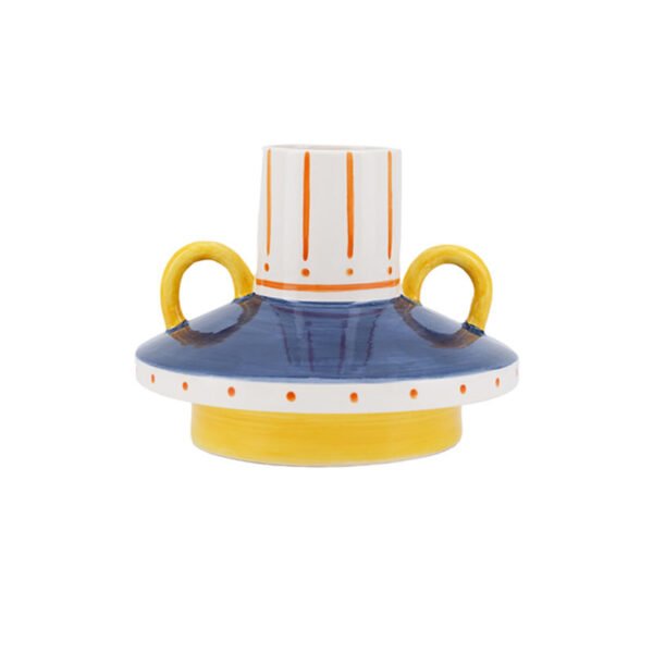Modern Avant-Garde Color-Block Ceramic Art Vase – Creative Disc-Structure Decorative Vessel, Yellow & Blue Geometric Striped Ornament, Pop Art Abstract Statement Piece, Premium Home Aesthetic Gift