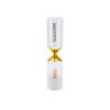 • Vertical sculptural silhouette: elongated cylindrical glass chambers connected by a polished gold-toned metal join — the form reads as modern sculpture while remaining a fully functioning hourglass.