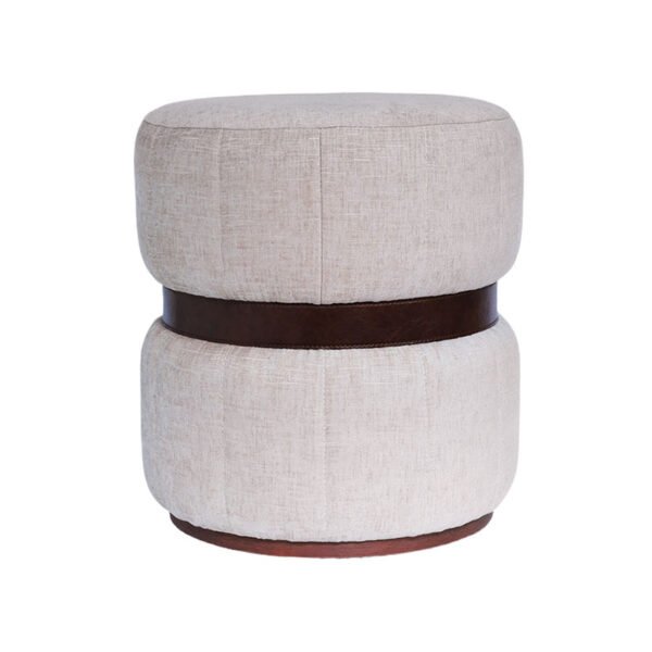 - ★This ottoman features a highly recognizable “hourglass” double-layer structure, upholstered in a delicately textured cream white breathable fabric that is soft to the touch and resilient. The center of the stool is encircled by a broad dark brown leather decorative belt, featuring clear stitching details and a refined connection that evokes a sense of high-end luxury fashion. The solid wood base at the bottom not only provides sturdy support but also echoes the overall color scheme with its deep wood grain, making it a functional and artistic masterpiece of home decor.