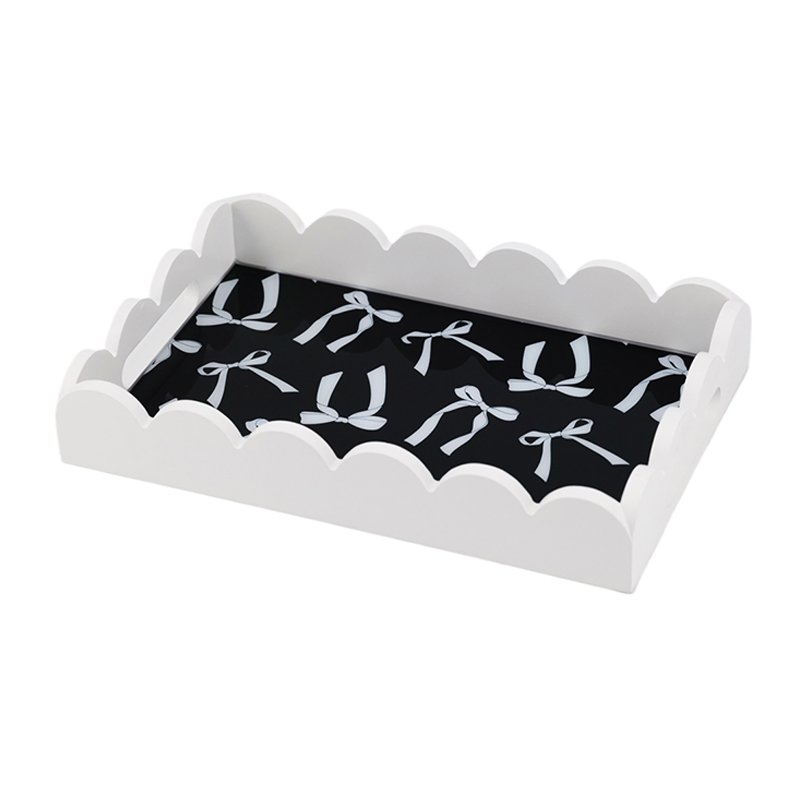 - ★Unique Scalloped Edge and Black/White Bow Pattern: This tray features a classic rectangular structure, but the side railings are designed with delicate, continuous scalloped edges. This cream-white (or white) wood or composite frame provides a soft aesthetic. The inner bottom of the tray is lined with a high-gloss black base, overlaid with a repeating white ribbon bow pattern, creating an elegant yet playful black and white contrast Home Decor style. The ends of the tray have cutouts (assumed handles) for easy lifting.