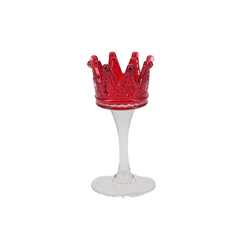 - ★Unique Crown Shape with Tall Stem Design: This eye-catching glass candle holder features a clear, tall-stem base topped with an exquisite red glass “Crown” cup, adorned with textured raised dots. The overall look is regal yet playful, with the clear base contrasting beautifully with the striking red top. The high-quality glass material allows it to cast brilliant reflections under candlelight, adding a fairy-tale luxury to your table.