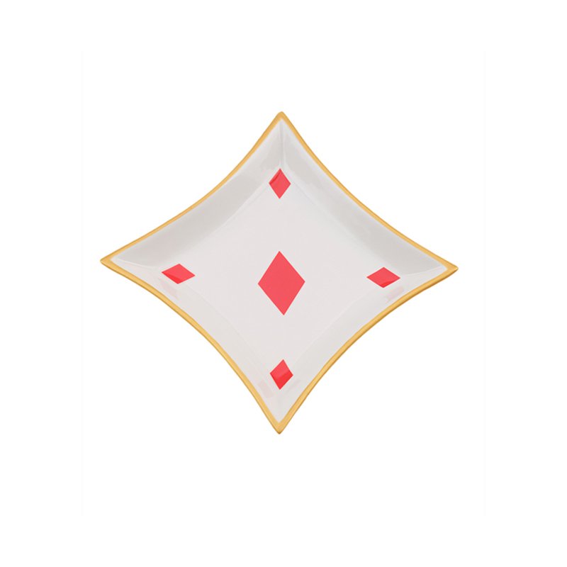 - ★Unique Diamond Card Shape and High-Gloss Ceramic: This tray is expertly crafted from high-quality ceramic with a smooth, fine glaze. Its distinctive exterior perfectly mimics the “Diamond” poker card suit, featuring luxurious gold trim around the edges and a prominent red diamond suit in the center. Its novelty shape and high sheen make it an impressive desktop art piece blending fun and sophistication.