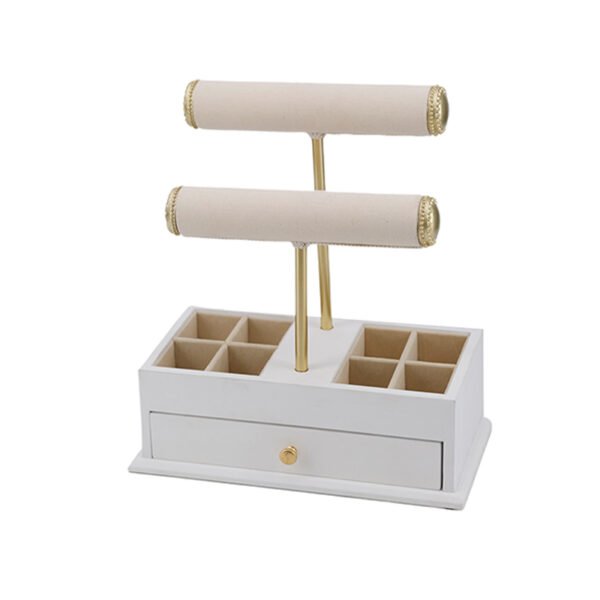 Luxury Jewelry Stand Organizer with Double T-Bar Bracelet Holder, Wooden Base with Drawer and Compartments, White and Gold Jewelry Display Stand for Necklaces, Bracelets, Earrings,