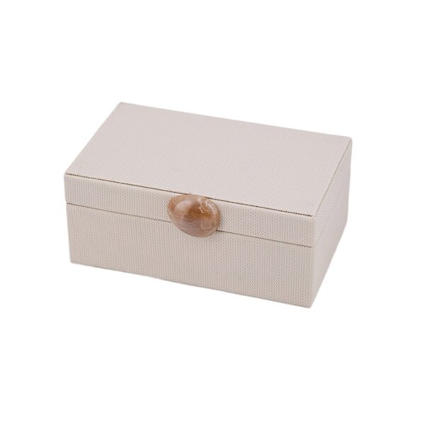 - ★Refined Light Beige Woven Texture Exterior with Natural Agate/Amber Clasp: This jewelry box features a classic rectangular prism shape with clean lines. The exterior is wrapped in a layer of light beige or sand-colored leather/faux leather material, which has a delicate woven texture (like fine fabric or bamboo matting), offering a premium and tactile feel. The most distinctive focal point is the natural amber/brown agate-patterned circular clasp at the center, which possesses a translucent sheen and organic marbling, creating an elegant yet soft visual contrast with the light-colored body. The overall design perfectly blends modern storage functionality with natural light luxury elements, making it a unique desktop Ornament.