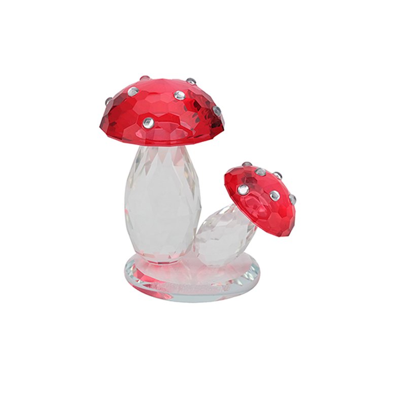 - ★Clear Faceted Double Mushroom Combination: This figurine features a pair of mushrooms of different sizes, mounted on a transparent faceted crystal disc base. Both mushroom caps are crafted from brilliant red crystal material, featuring multiple faceted cuts to maximize light reflection. Each red cap is accented with inlaid sparkling rhinestones or diamonds, while the stems are made from transparent faceted crystal, creating a layered and dreamy, fairy-tale aesthetic.