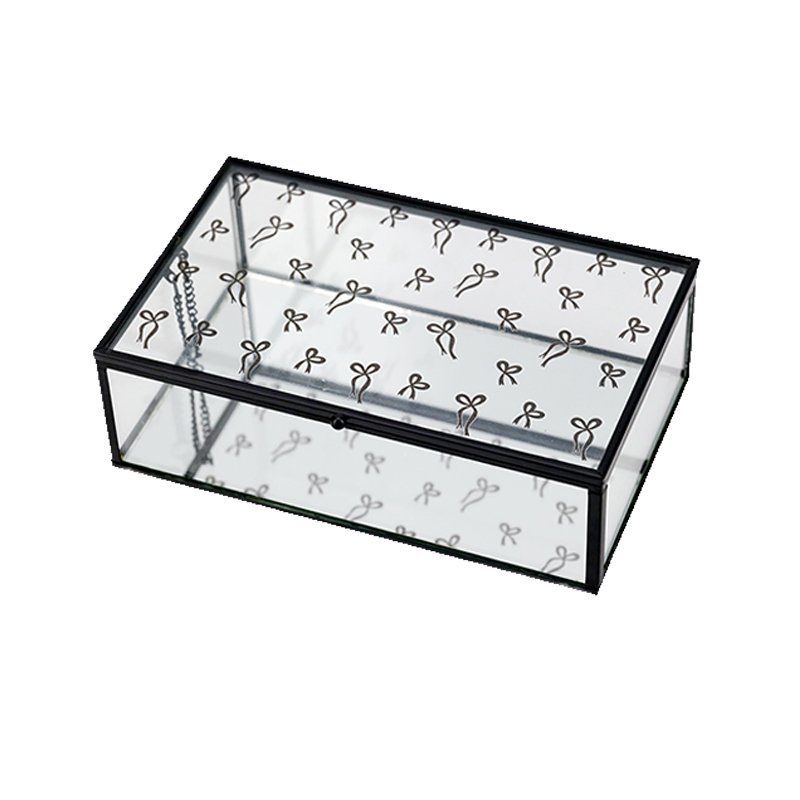 Home - HOME DECOR - Jewelry Box - French Romantic Bow Glass Jewelry Box – 16cm Mirror Decorative Trinket Organizer, Metal Framed Glass Box with Silk-Printed Bow Art, Modern Elegant Keepsake Case for Rings & Vanity Accents, Chic Home Decor Gift
