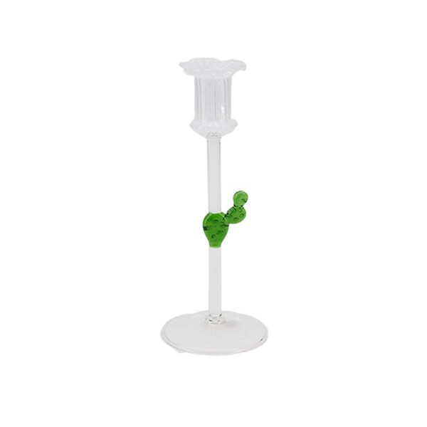 Floral Green Glass Candlestick with Cactus Decoration, Transparent Base, Artistic Candle Holder, Suitable for Taper Candles, Decorative Candlestick