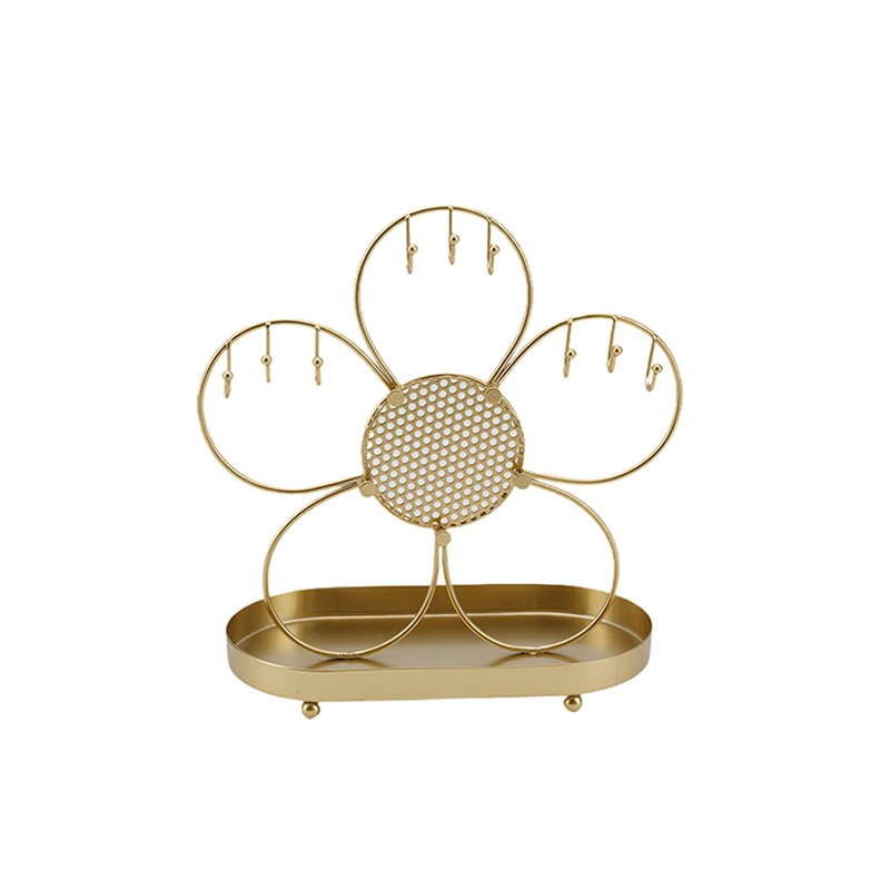 Home - HOME DECOR - Jewelry rack - Gold Metal Flower – Shaped Jewelry Stand with Base Tray & Multiple Hanging Hooks, Elegant Organizer for Earrings, Necklaces & Rings