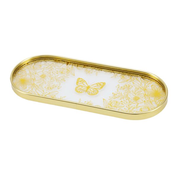 - ★This exquisite piece is a tray featuring an oval shape with a gleaming gold rim, a white base, and a charming golden butterfly – floral pattern. It instantly adds a touch of elegance and artistry to any setting, whether for serving or decoration.