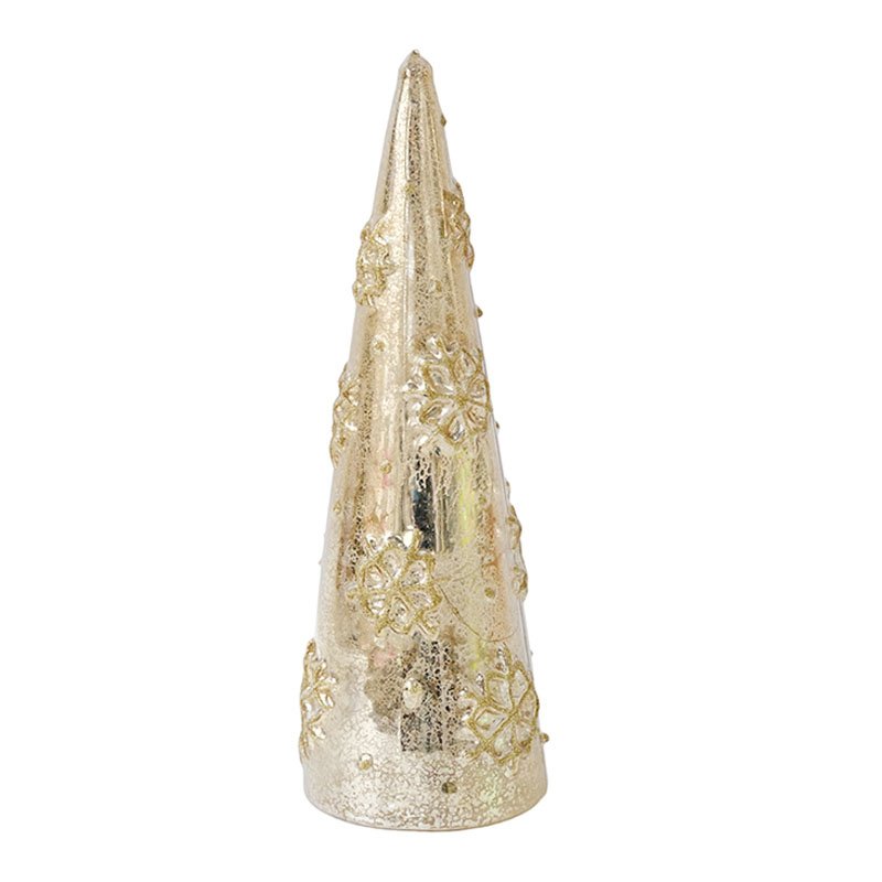 - ★This exquisite festive Ornaments piece features a classic conical Christmas tree shape, sharp at the top and widening towards the base. The main body utilizes a unique gold mercury glass technique, whose surface has a subtle mottled texture that creates a gorgeous reflective effect. Most notably, the surface is uniformly adorned with three-dimensional, embossed gold snowflake patterns; these snowflake details are clear and may feature fine glitter or microbead embellishments, adding rich festive atmosphere and tactile interest to the smooth gold surface. The overall design is both abstract and full of holiday cheer, making it an elegant home decor accent.