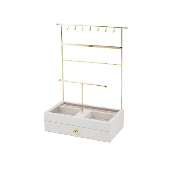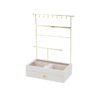 Gold Metal Jewelry Stand with Drawer, Multi-Tier Jewelry Holder Stand for Earrings, Necklaces, Bracelets and Rings, Jewelry Stands with Hooks, Bar, Velvet Compartments, White Wooden Base