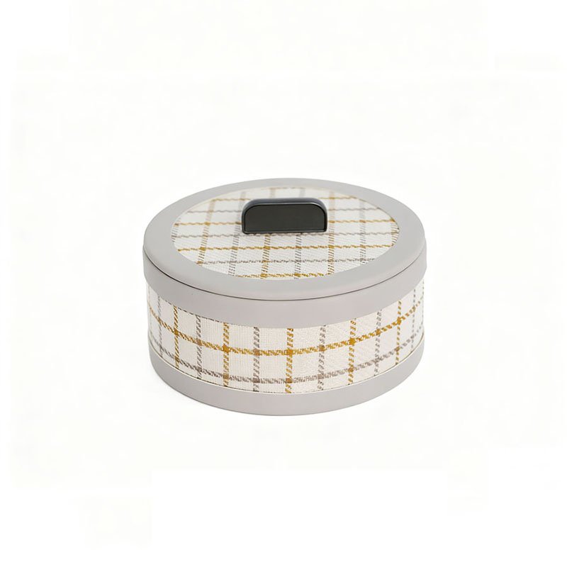 - ★This jewelry organizer features a unique circular silhouette, crafted with high-quality grey PU leather borders and an elegant gold-and-white plaid fabric inlay. The top is accented with a minimalist black rectangular handle, which not only ensures easy opening but also adds a touch of modern sophistication. The fine stitching and smooth texture showcase the superior craftsmanship expected of a premium PU jewelry box.