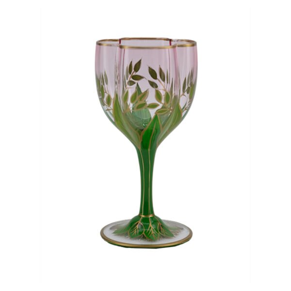 Hand – Painted Pink & Green Floral Leaf Wine Glass with Gold Accents, Artistic Goblet for Wine Tasting & Home Decor
