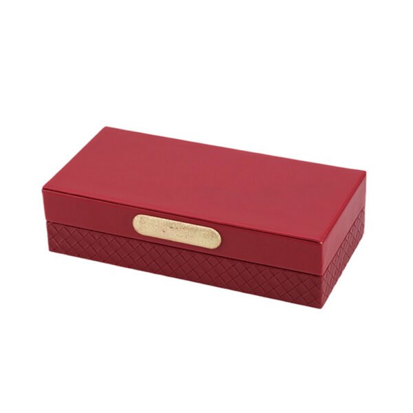 • Glossy Burgundy Leather with Detailed Textured Base: This jewelry box features an elegant rectangular design, with the upper portion covered in high-gloss burgundy faux leather for a smooth, reflective finish. The lower base is adorned with a sophisticated diamond quilted texture, creating a unique visual contrast and layering effect. A rectangular gold accent strip is centrally embedded on the front of the lid, serving as a striking embellishment that enhances the overall luxury and design appeal.