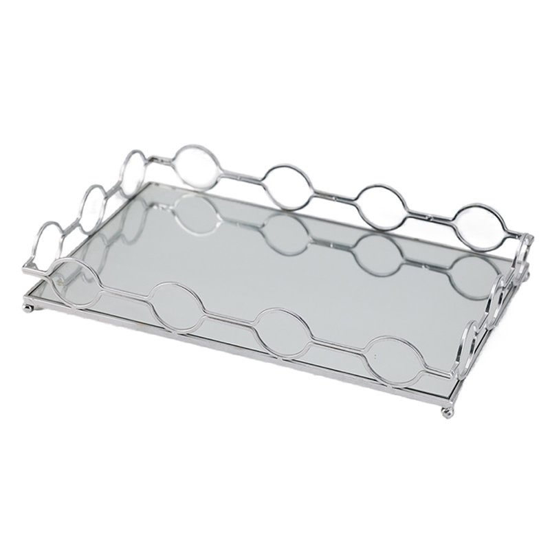 - ★Elegant Circular Pattern Design – The tray features a striking silver-tone metal frame with interlinked circular patterns on all sides, combined with a reflective mirrored base that enhances its modern yet timeless elegance.