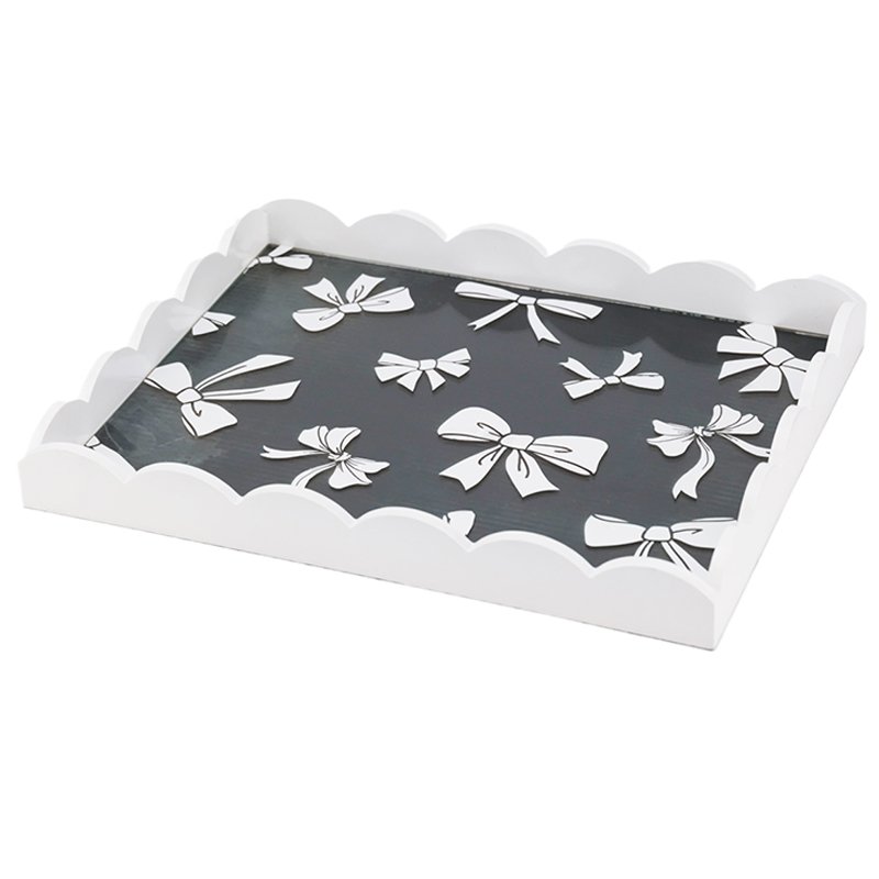 large-sized Bow-Patterned Black & White Decorative Tray with Scalloped Edge, Stylish Organizer Tray for Home, Vanity & Coffee Table Tray