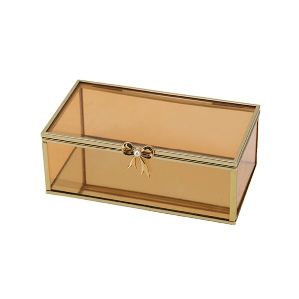 - ★Transparent Glass Jewelry Box – Rectangular jewelry box with golden edges and a ribbon clasp, showcasing your accessories elegantly.