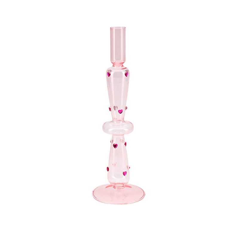 - ★Unique Pink Translucent Stem Structure with Multi-Heart Tiered Orb Design: This candle holder is crafted from dreamy light pink transparent glass, presenting an elegant and tall silhouette. Its base is smooth and round, while the central stem is formed by three stacked concentric orbs, providing stability and visual intrigue. Each orb is cleverly embedded with multiple tiny bright pink hearts, which sparkle sweetly against the pink glass background. The top candle cup is a simple cylindrical shape, designed to securely hold taper candles. The overall design of this glass candle holder is rich in layers and feminine charm, serving as a one-of-a-kind visual focal point.