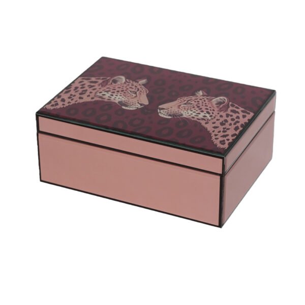 - ★Dual Leopard Totem Design & Captivating Pink and Black Appearance Features- This jewelry storage masterpiece, stands out with its narrative “Dual Leopard” lid art, featuring a deep burgundy leopard-spotted background with two finely detailed, lifelike leopard heads at the center, showcasing a wild yet noble aesthetic. The sides of the box are wrapped in a pure, warm nude-pink mirrored finish, offering an elegant hue with a soft, lustrous glow. Adopting a steady rectangular geometric construction, it is framed by precise thin black lines that perfectly blend wild totem elements with modern soft pink tones, making it a highly recognizable focal point for any vanity.